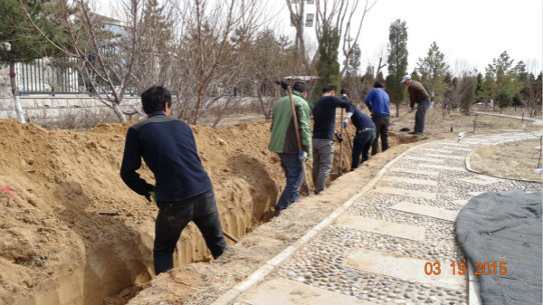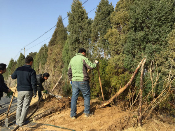 三月,空氣中依然透著寒意,這并沒有阻擋大家植樹的熱情。在李忠飛總經(jīng)理的現(xiàn)場指導(dǎo)下,會議中心全體員工以及路橋公司員工人頭攢動,不怕風(fēng)吹日曬、不怕饑餓口渴,不辭辛勞、鐵鍬揮舞,挖樹坑、拉樹苗、放樹苗、填土、踩實、澆水,一派熱火朝天的勞動景象。經(jīng)過大家五天的共同努力,130余棵園柏栽種成功,圓滿完成了預(yù)期任務(wù)。大家看著親手栽種的園柏,滿是欣喜,這些青翠勁挺的園柏給會議中心增添了一抹靚色。