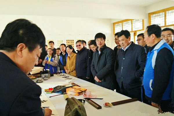基泰路橋公司總經(jīng)理李學(xué)彥(右三)陪同苗豐書記參觀了書畫展、書法現(xiàn)場筆會(huì)、攝影展、文藝演出、常樂堡老年幸福院等,并為牛家梁鎮(zhèn)評選出的十個(gè)“十佳”稱號(hào)獲得者頒獎(jiǎng)。