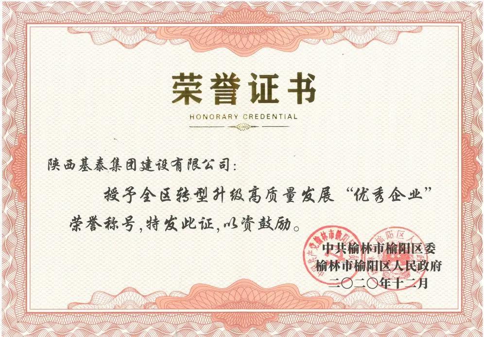 3月3日,在榆陽(yáng)區(qū)第十八屆人民代表大會(huì)第七次會(huì)議閉幕會(huì)上,區(qū)委、區(qū)政府對(duì)授予全區(qū)轉(zhuǎn)型升級(jí)高質(zhì)量發(fā)展的30戶“優(yōu)秀企業(yè)”進(jìn)行了表彰。陜西基泰集團(tuán)建設(shè)有限公司被中共榆林市榆陽(yáng)區(qū)委、榆林市榆陽(yáng)區(qū)人民政府授予全區(qū)轉(zhuǎn)型升級(jí)高質(zhì)量發(fā)展“優(yōu)秀企業(yè)”榮譽(yù)稱號(hào)。